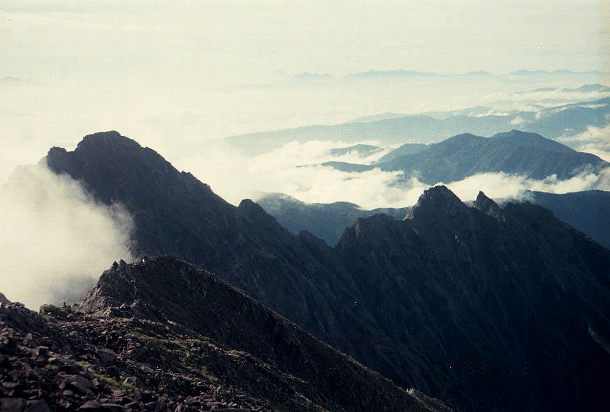 吊り尾根から前穂高岳、明神岳を望む。