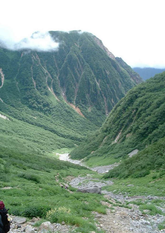 槍沢、登って来た道を振り返る。