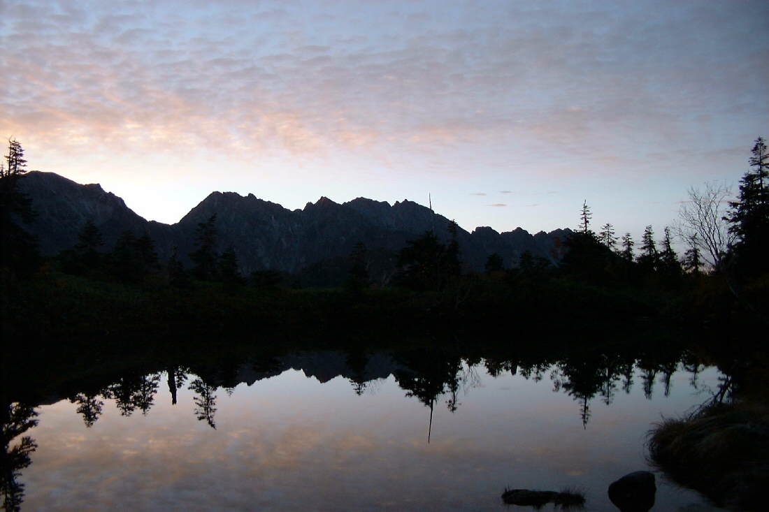 赤く染まった雲と、穂高連峰のシルエットが美しい。