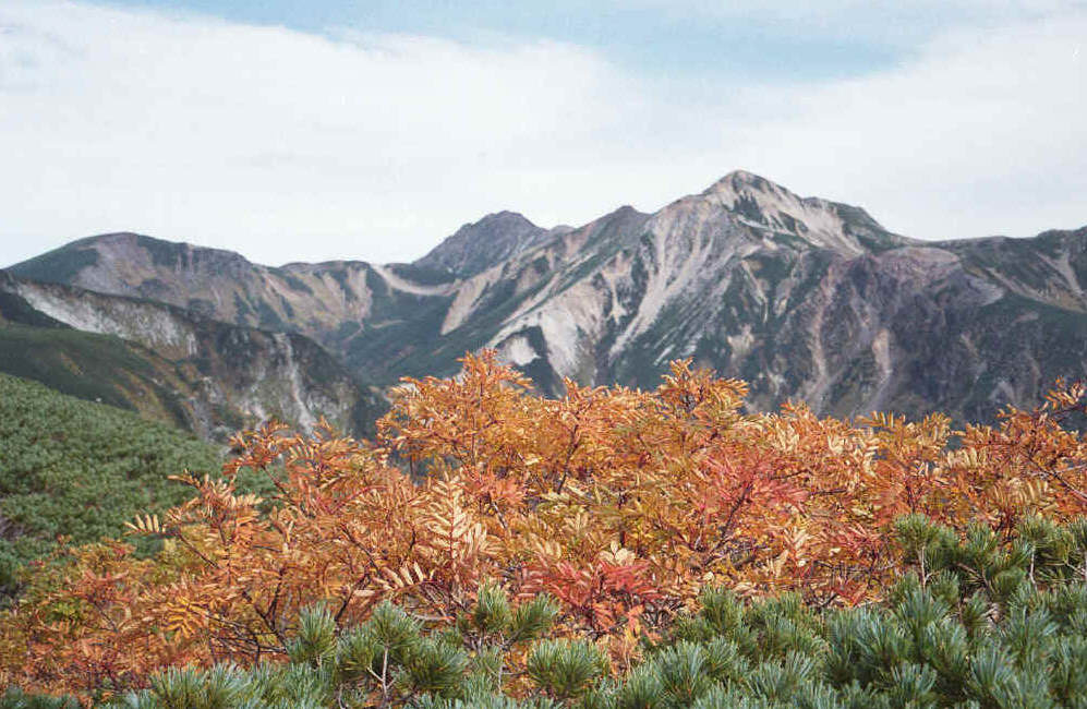 ナナカマドの紅葉と鷲羽岳