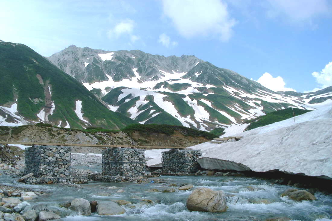 称名川を渡る。雪解け水で顔を洗う。数秒も手を入れておけない。