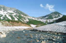 みくりが池には雪がたくさん残っていた。 後ろに剣御前岳と雷鳥沢が見える。 |