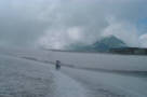 室堂のバスターミナルまで後少し。 雪渓をガスが流れ、幻想的なムードを創り出す。 |