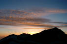 最後の夜、雷鳥荘から見た夕焼け。 大日岳と奥大日岳の間へ沈んでいった。 |
