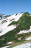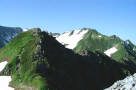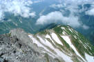 山頂横の雪渓から八ッ峰を撮影した。 チョット恐かった。 |